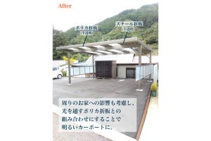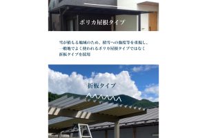 一般的なポリカ屋根ではなく、強度に優れた折板タイプを採用し、安心してお使いいただける構造としています。