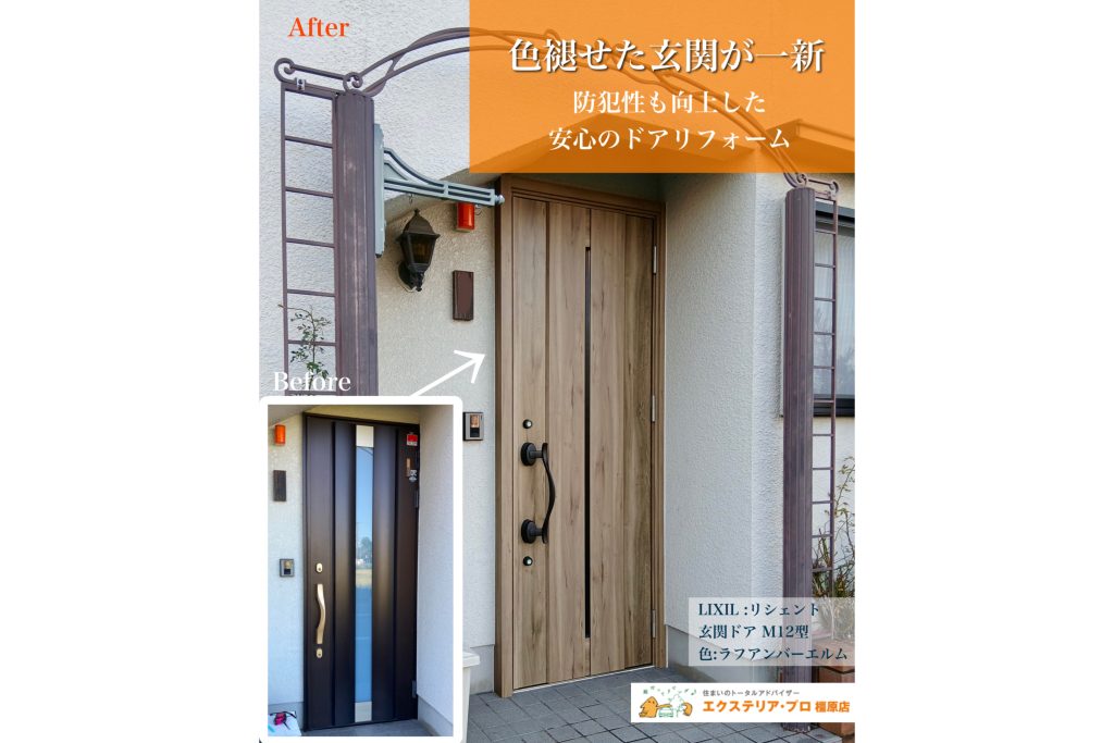 玄関ドアの鍵の不調をきっかけに、全体的な色褪せや経年劣化、防犯面への不安をなくすため、玄関ドアをLIXIL「リシェント」に一新した施工事例です。